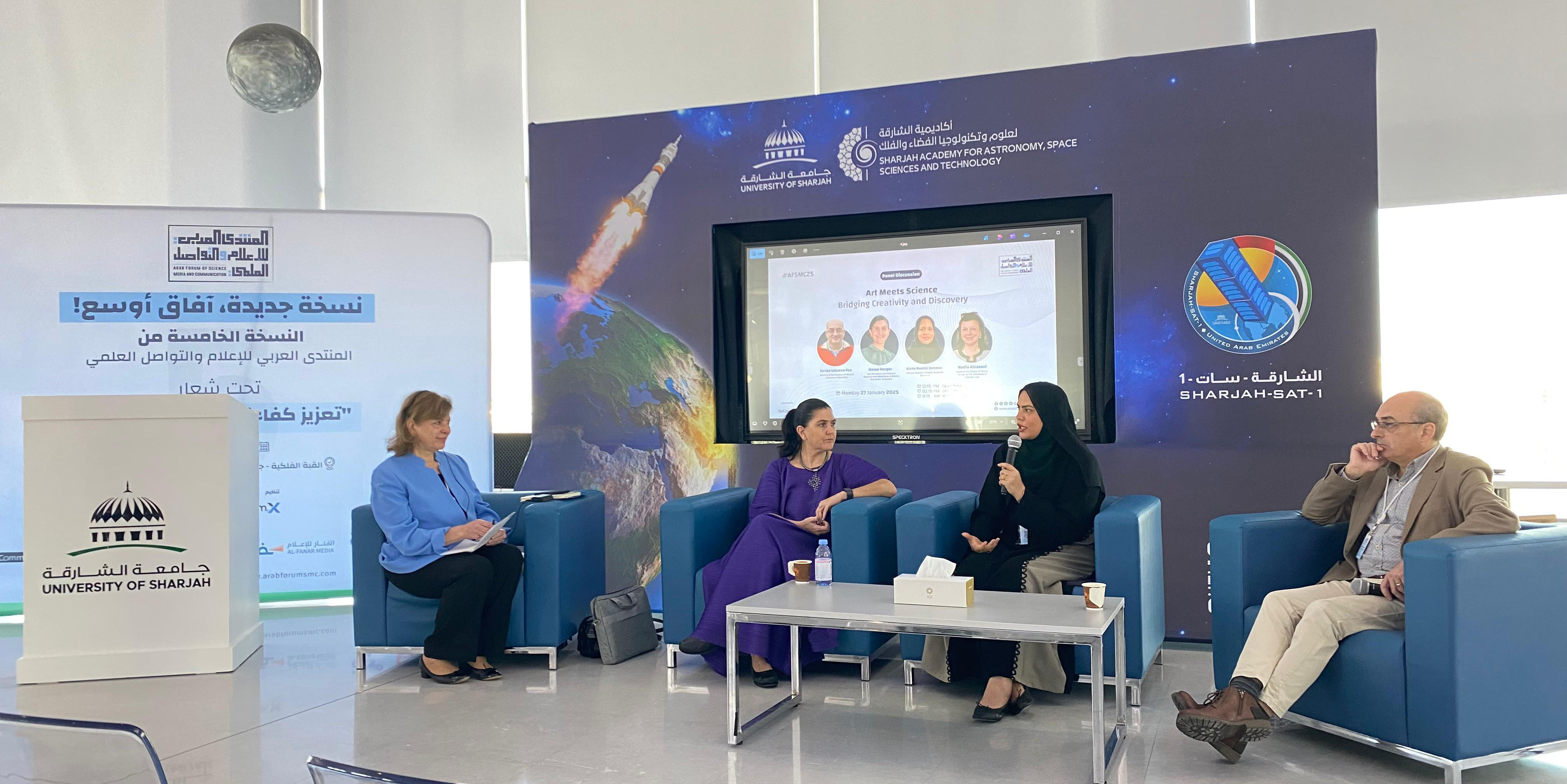 في مقر أكاديمية الشارقة لعلوم وتكنولوجيا الفضاء والفلك سبل تعزيز وصول العلوم وتأثيرها في العالم العربي واستخدام التكنولوجيا الحديثة في السرد العلمي وتبسيط الأبحاث للجمهور.