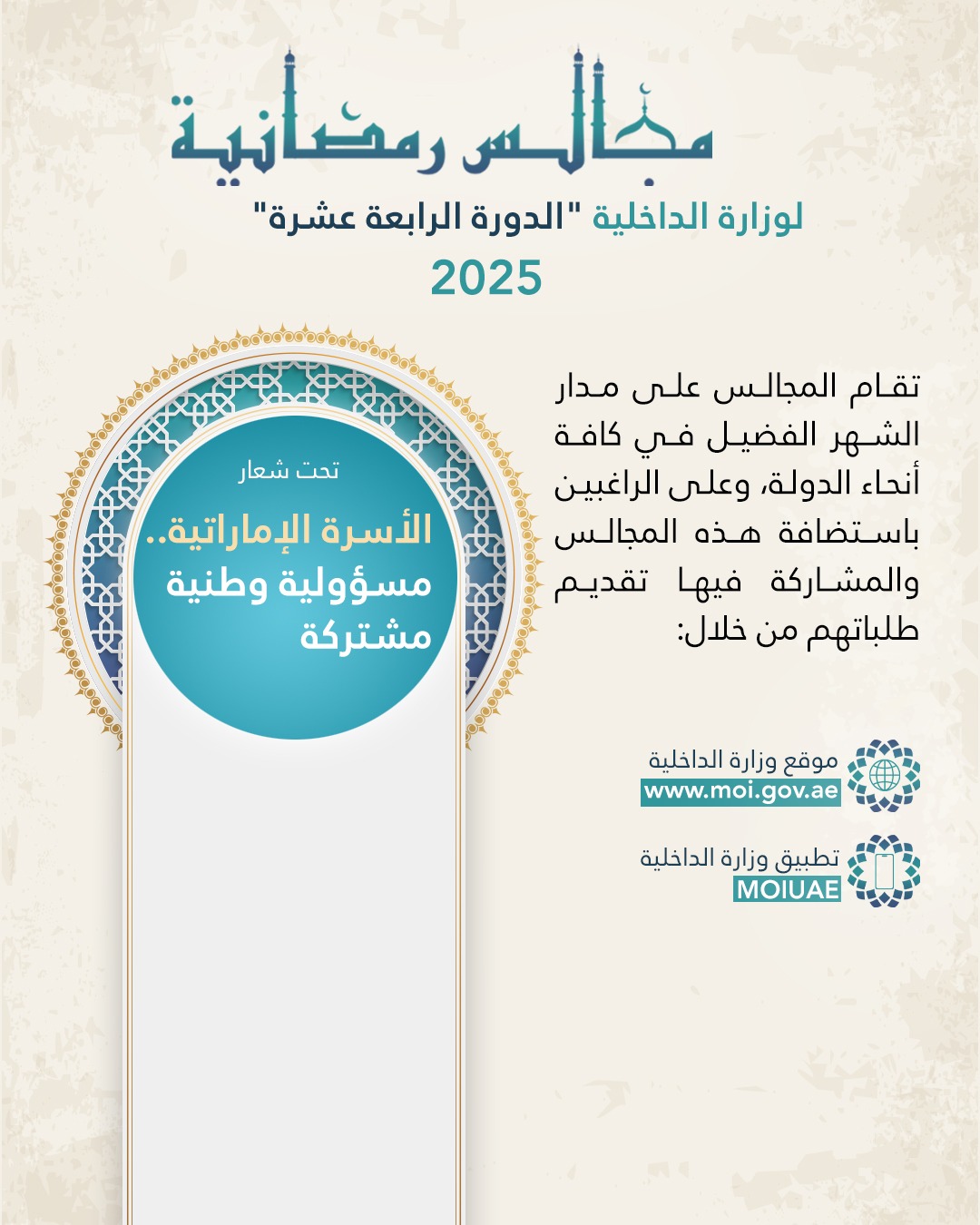 أبوظبي في 28 فبراير/ وام/ تنطلق في 11 مارس المقبل، أولى جلسات مجالس وزارة الداخلية في دورتها الرابعة عشرة تحت شعار “الأسرة الإماراتية .. مسؤولية وطنية مشتركة”، والتي تناقش مواضيع ومحاور مجتمعية وأسرية انسجاماً مع إعلان القيادة الرشيدة عام (2025) “عام المجتمع”.