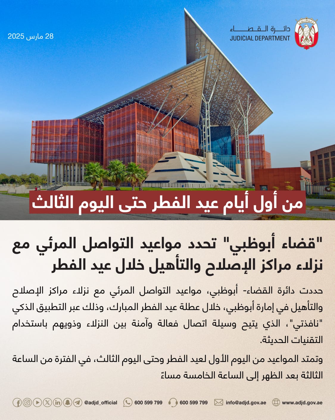 "قضاء أبوظبي" تحدد مواعيد التواصل المرئي لنزلاء مراكز الإصلاح والتأهيل خلال عيد الفطر