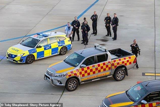 أظهرت صور من مطار لوتون نشر سيارات الإسعاف وقوات الشرطة المسلحة على المدرج تحسبا لأي حالة طوارئ ، بينما شوهدت مروحية ترامب "البحرية وان" و"البحرية ل" توقف بالقرب من المدرج.