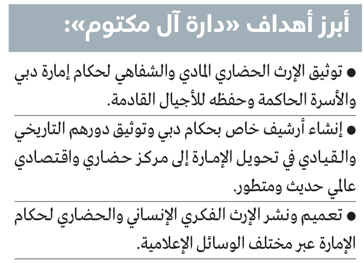 واطلع صاحب السمو الشيخ محمد بن راشد آل مكتوم، خلال الحفل، على رسالة الدائرة وأهدافها وخططها لبناء سجل رقمي متكامل لحكام إمارة دبي وآل مكتوم، وإعداد كوادر وطنية لإدارة الدائرة متخصصة في مجال أرشفة السجل وإدارته وتنظيمه والإشراف عليه، والعمل كمرجع رئيسي لصناع القرار والباحثين، الأكاديميين والمهتمين، للاستفادة من مسيرة وإرث حكام الإمارة. قيادية وفكرية وسياسية واجتماعية وإدارية.