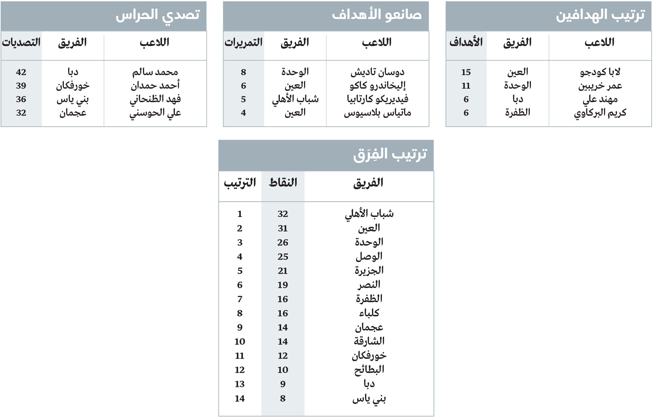 وشهدت الجولة أربع بطاقات حمراء مباشرة، جاءت جميعها في مباراتين فقط. وتلقى ثنائي الوحدة فافور أوجبو وفاكوندو دانييل البطاقة الحمراء في مواجهة العين، وخرج أصحاب السعادة بصعوبة بالتعادل 2-2. أما دبا فدفع ثمناً باهظاً لطرد سيمون كابرال وإياجو أزيفيدو بخسارة ثقيلة بسبعة أهداف نظيفة.